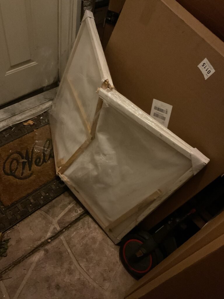 The shipping services didn’t just break the canvases, they destroyed them. Yes, there’s two canvases there. There was no protection except some half-assed wrapping with bubble wrap. This is supposed to be protection on a package shipped from China?